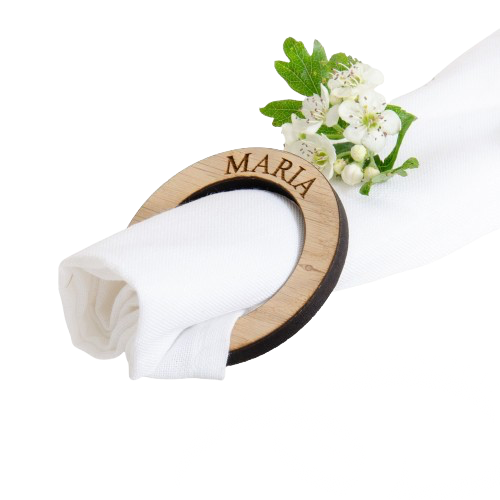 Houten servetring is niet alleen mooi, maar ook handig om de tafelindeling aan te geven.